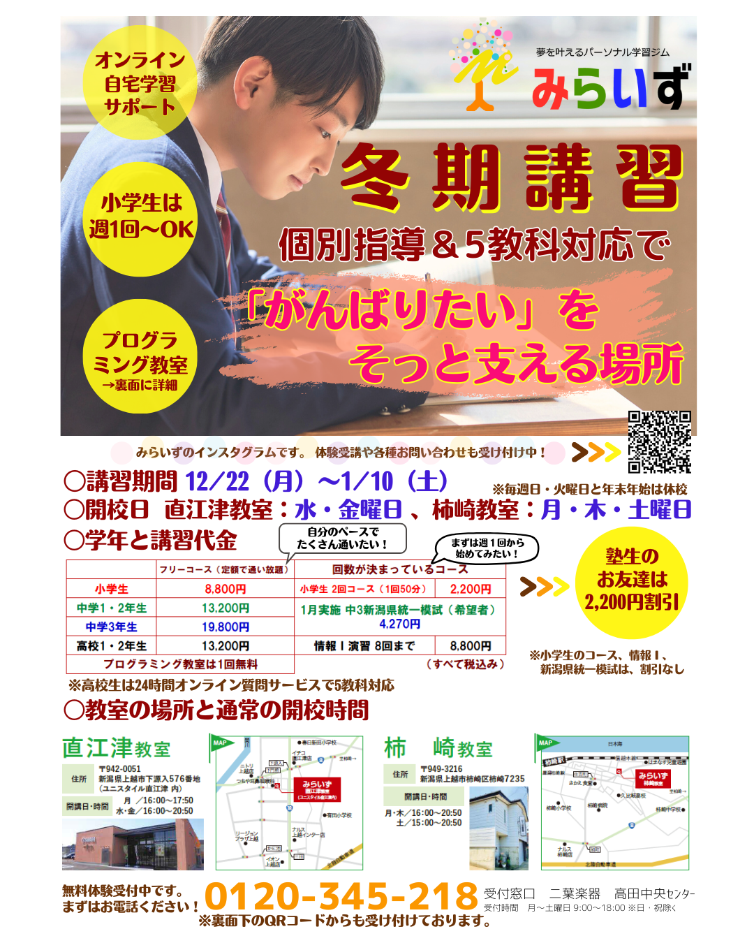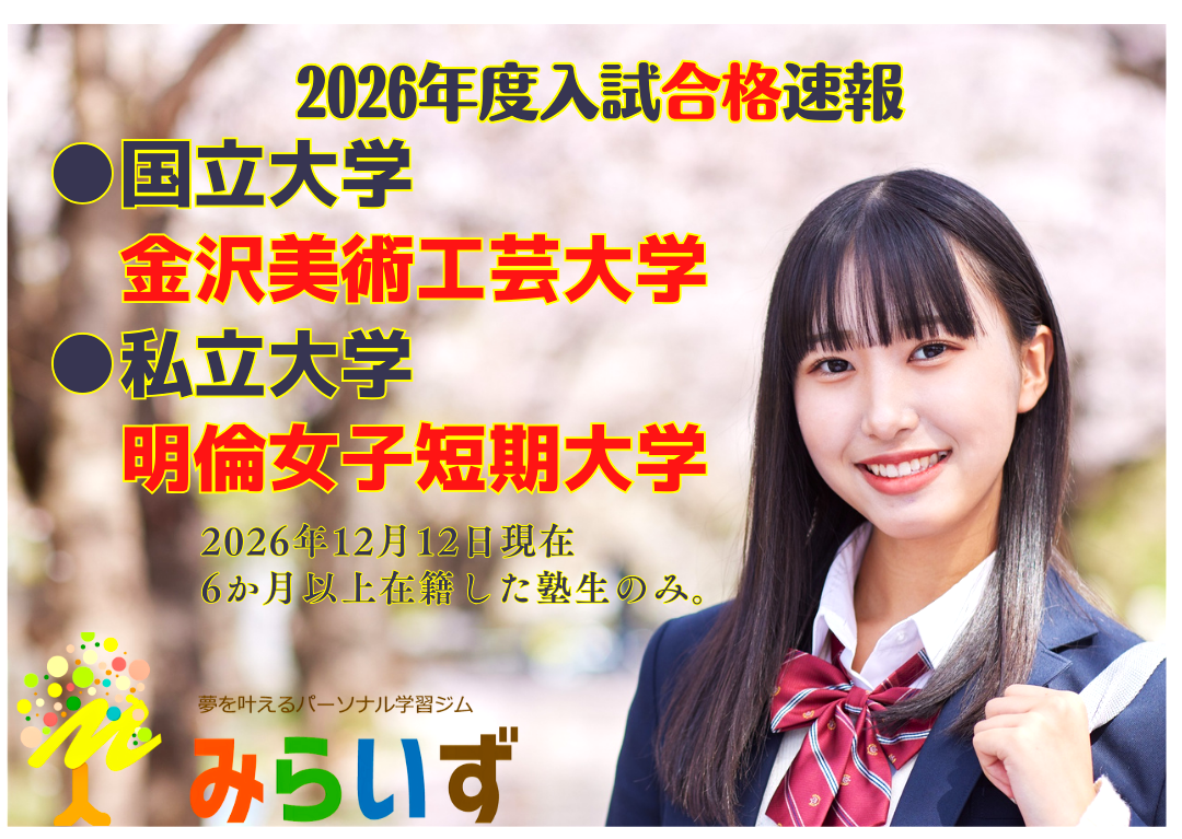 みらいずからのご案内 2025年12月13日 12/22(月)~冬期講習が始まります。5教科対応、各種検定対策、そして中3対象の必ずできるようになる英作文とリスニングの講座もすべて定額で追加料金は一切ありません! 皆様のご参加、お待ちしております!